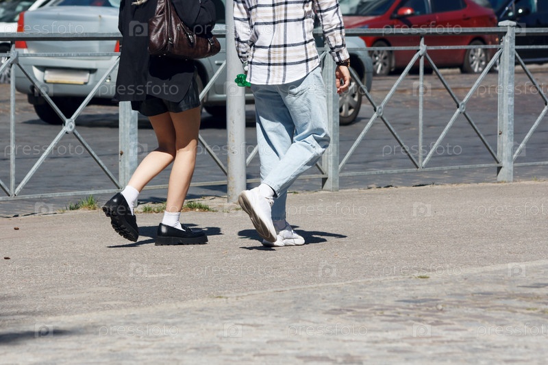 Люди гуляют по городской улице в летний солнечный день