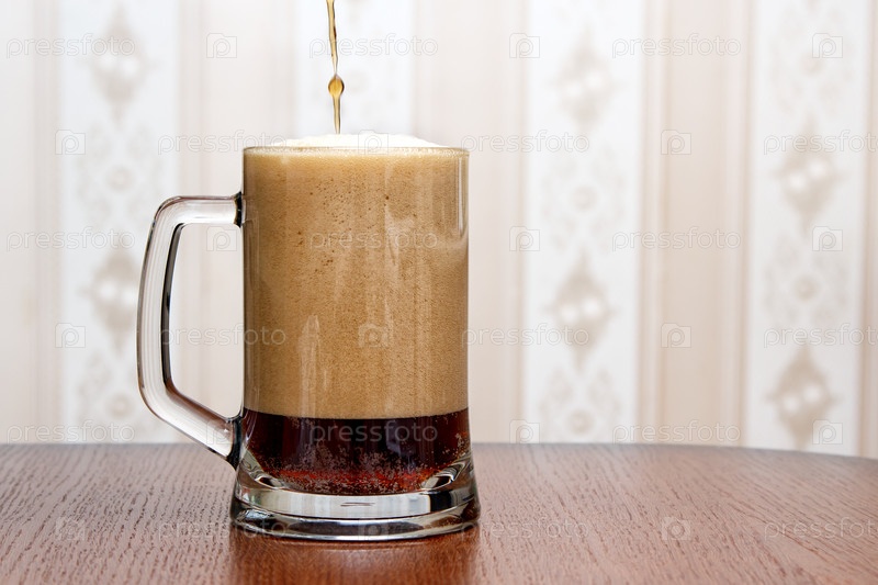 Темное пиво наливается в стеклянную кружку. Крытый крупный план