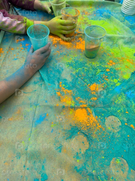 Разноцветные краски падуба разбросаны по столу