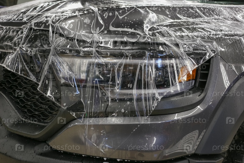 Специалист по автомобильному клею наклеивает на автомобиль полиуретановую пленку. Селективный фокус. Защитная пленка PPF от щелей и царапин. Автомобильный клей