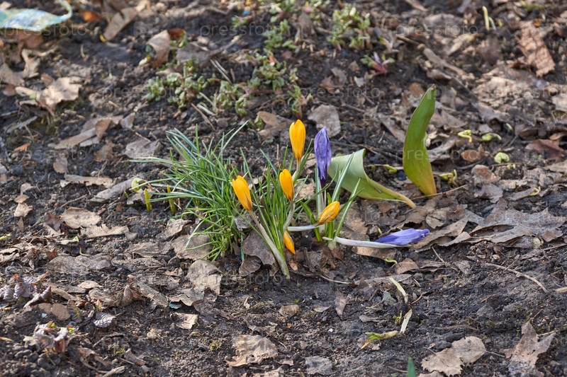 На лужайке в саду цветут крокусы. род многолетних клубневых травянистых растений семейства Иридовые (Iridaceae)