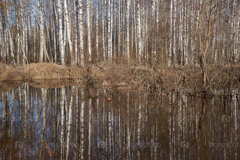 Ранняя весна. Отражение деревьев в воде на опушке леса
