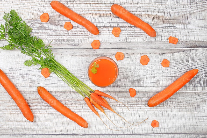 Детокс-напиток в стеклянном кубке, ломтиках моркови и петрушки на деревянном фоне. Свежий натуральный морковный коктейль или сок, концепция похудения, свежие фрукты и овощи, реклама кафе, избирательный фокус