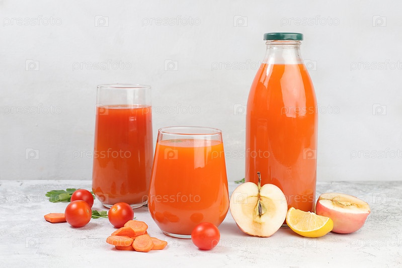 Детокс-напиток в стеклянной банке и стакане, кусочки моркови, яблок и помидоров на светлом фоне. Свежий натуральный морковно-яблочный коктейль или сок, концепция похудения, свежие фрукты и овощи, выборочный фокус