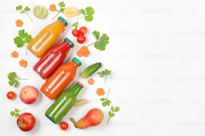 Органические томатный, морковный, шпинатный и яблочный соки или смузи в стеклянных бутылках с ингредиентами и зелеными листьями на светлом бетонном фоне, макет для рекламы и демонстрации продукции, выборочный фокус