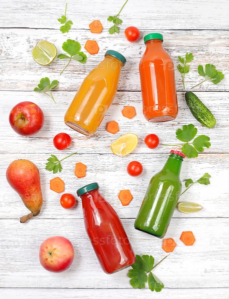 Органические томатный, морковный, шпинатный и яблочный соки или смузи в стеклянных бутылках с ингредиентами и зелеными листьями на светлом бетонном фоне, макет для рекламы и демонстрации продукции, выборочный фокус