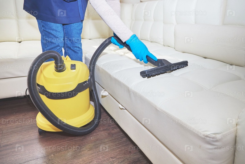 Девушка пылесосит диван в помещении промышленным пылесосом