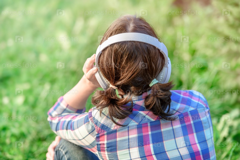 Девушка слушает музыку в наушниках в траве