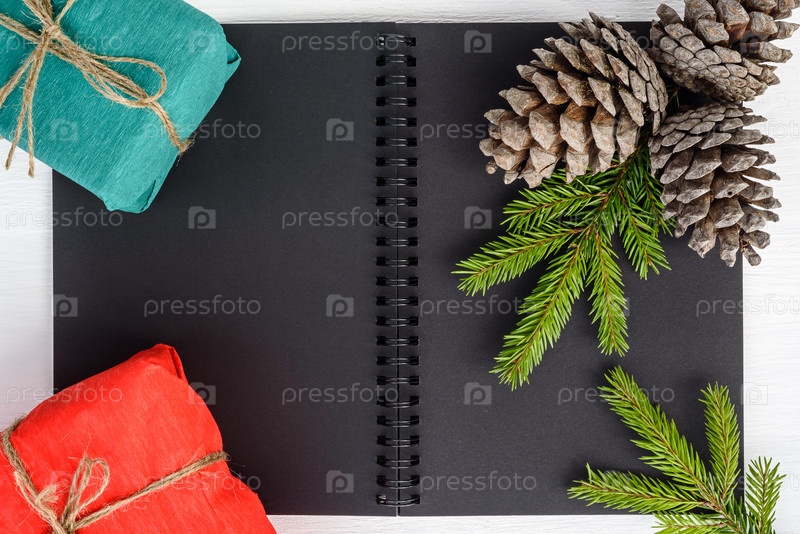Рождественский фон. Вид сверху на блокнот и новогодний декор