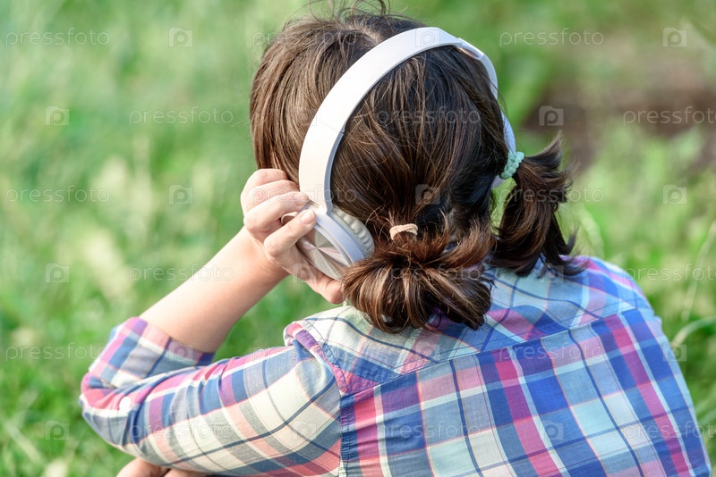 Девушка слушает музыку в наушниках в траве
