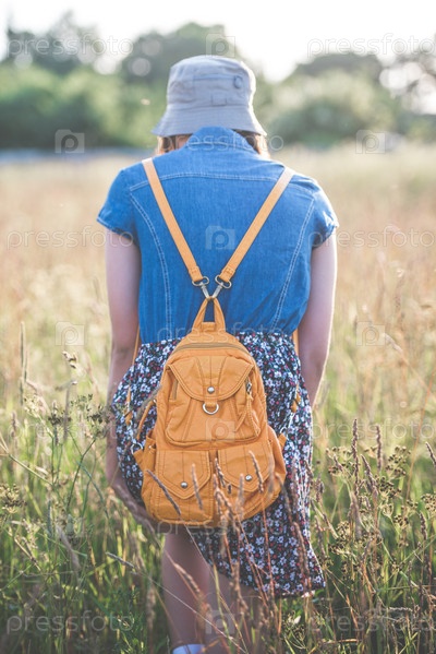 Девушка в платье и шляпе гуляет по полю на закате. Концепция отдыха на природе