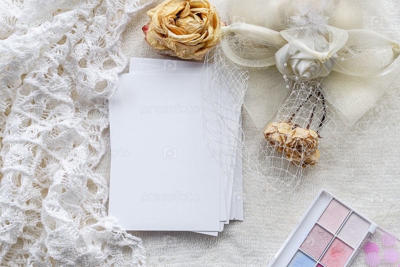 Модный женский фон на белой ткани - цветы, женские аксессуары и пустая открытка. Свадебный женский фон. Заготовка для открытки