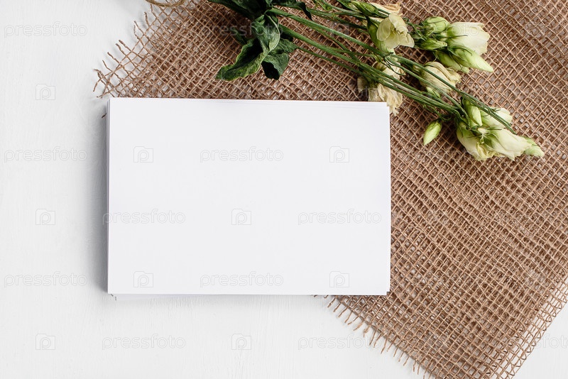 Модный белый фон с пустой открыткой и цветами. Вид сверху и пространство для копирования