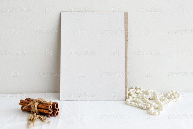 Модный фон канцелярских товаров - белая карточка для письма и веточки сухих растений на белом столе. Свадебный женский фон