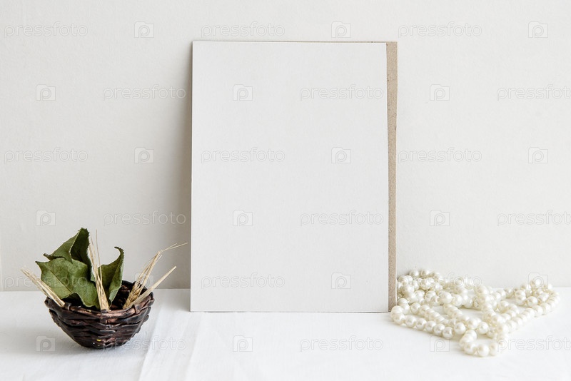 Модный фон канцелярских товаров - белая карточка для письма и веточки сухих растений на белом столе. Свадебный женский фон