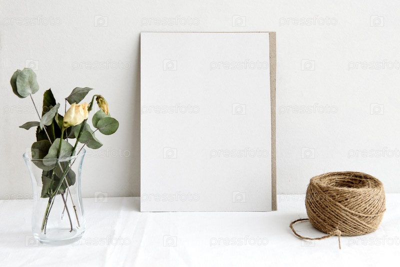 Модный фон канцелярских товаров - белая карточка для письма и веточки сухих растений на белом столе. Свадебный женский фон