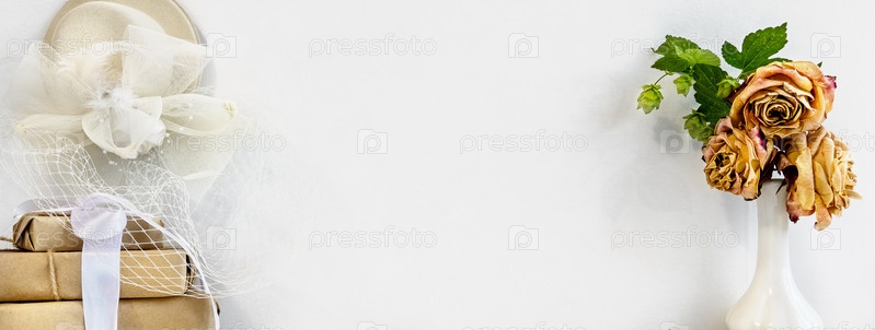 Модный белый фон — заготовка для открытки. Пустой бланк для надписи, сухие розы и белая шляпа с вуалью. Женский свадебный фон