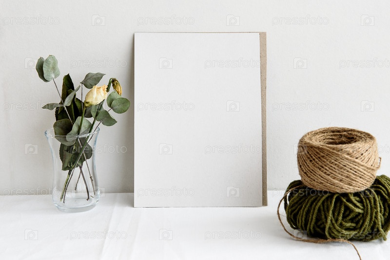 Модный фон канцелярских товаров - белая карточка для письма и веточки сухих растений на белом столе. Свадебный женский фон