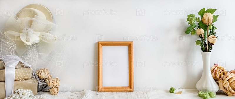 Модный фон канцелярских товаров - белая карточка для письма и веточки сухих растений на белом столе. Свадебный женский фон
