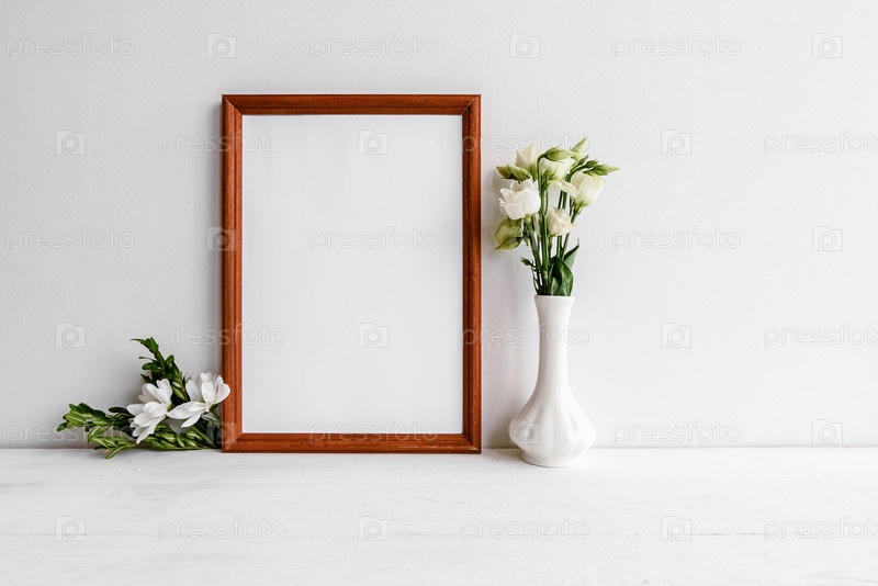 Модный женский фон на белом столе - цветы и пустая фоторамка. Свадебный женский фон. Заготовка для открытки