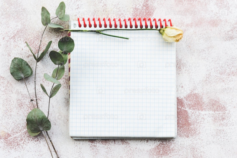 Канцелярские принадлежности романтический нежный фон-чистый блокнот, веточка эвкалипта и желтые розы. Вид сверху, крупный план и пространство для копирования