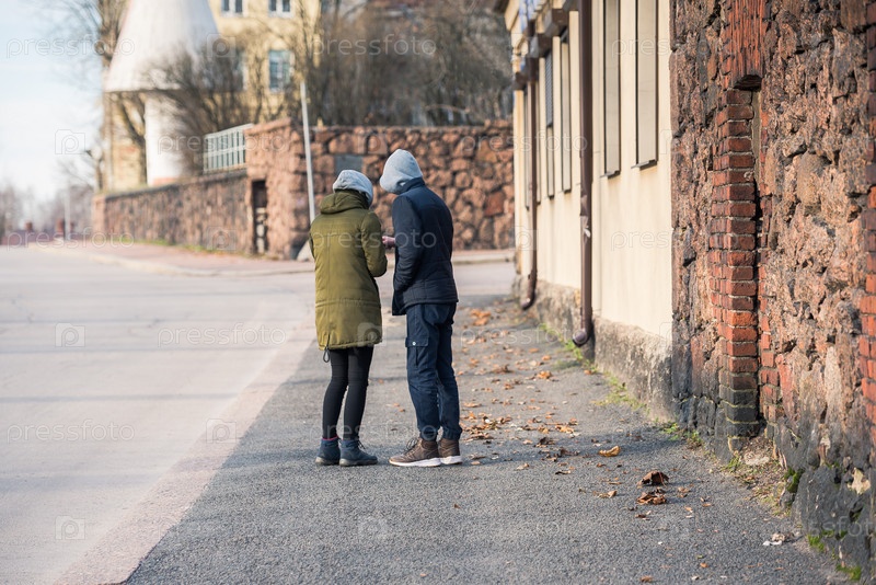 Россия, Выборг, 06.11.2019: парень и девушка гуляют по улицам древнего города Выборг
