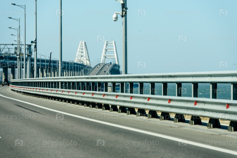 Россия, Крым, 11 сентября 2019 г.: Вид из окна машины. Крымский мост, новая железная дорога в Крыму. Крымновый, дорога