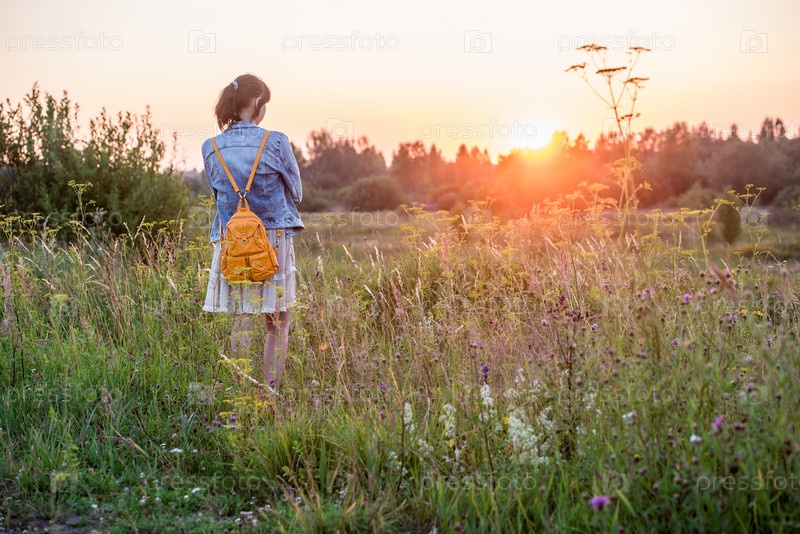 Молодая девушка в платье и с рюкзаком на природе на закате, вид сзади