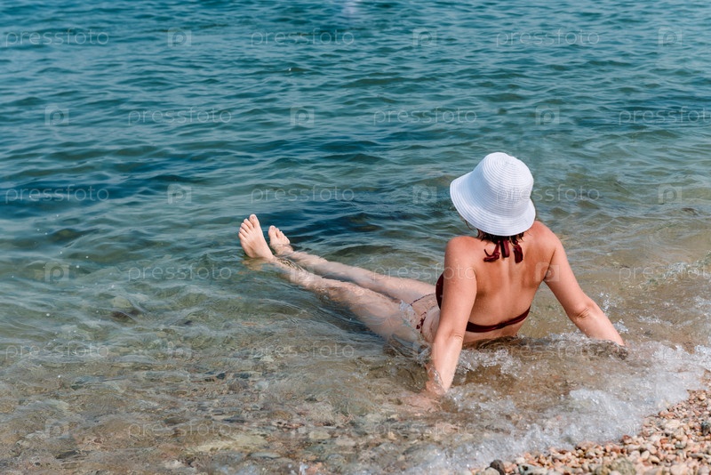 Море, пляж, волны и молодая женщина — концепция пляжного отдыха летом. Женщина в купальнике сидит в морской воде на мелком дне