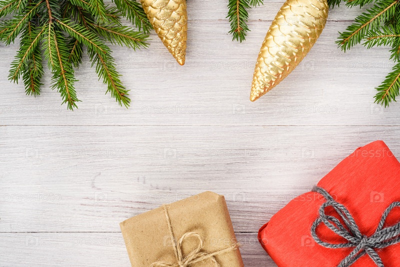 Рождественский фон - еловые ветки и подарки в упаковке из крафт-бумаги