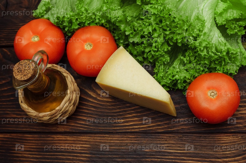 Красные помидоры, твердый сыр, оливковое масло и листья зеленого салата на темном деревянном фоне, вид сверху крупным планом с пустым местом для текста, концепции здорового питания, ужина и диеты, ингредиентов и приготовления пищи
