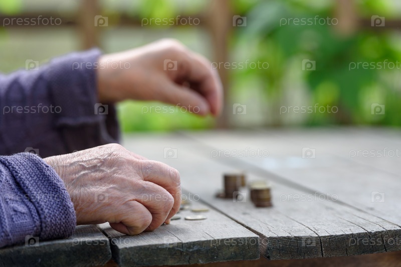 Деньги, монеты, бабушка на пенсии и концепция жизни, минимум - руки старухи пересчитывают монеты на деревянном столе