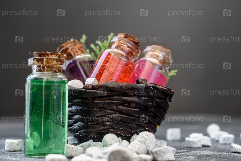 Гель для душа в стеклянных бутылках и соль для ванн на темном фоне. Спа-продукты и уход за телом
