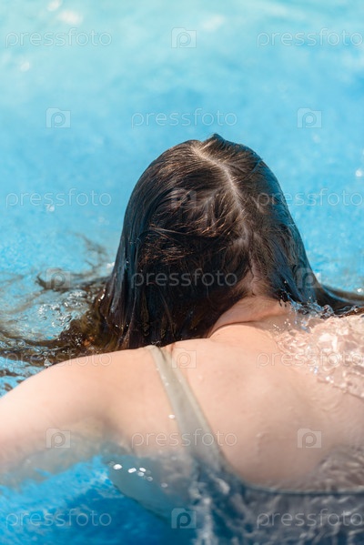 Молодая девушка плавает в бассейне, вид сзади крупным планом