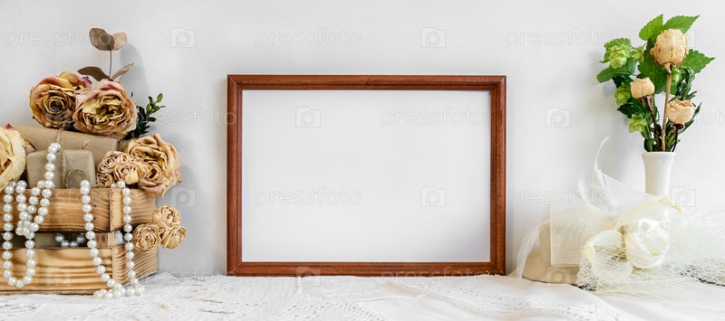 Модный белый фон с пустой фоторамкой, женскими украшениями и цветами. Заготовка для открытки. Женский свадебный фон