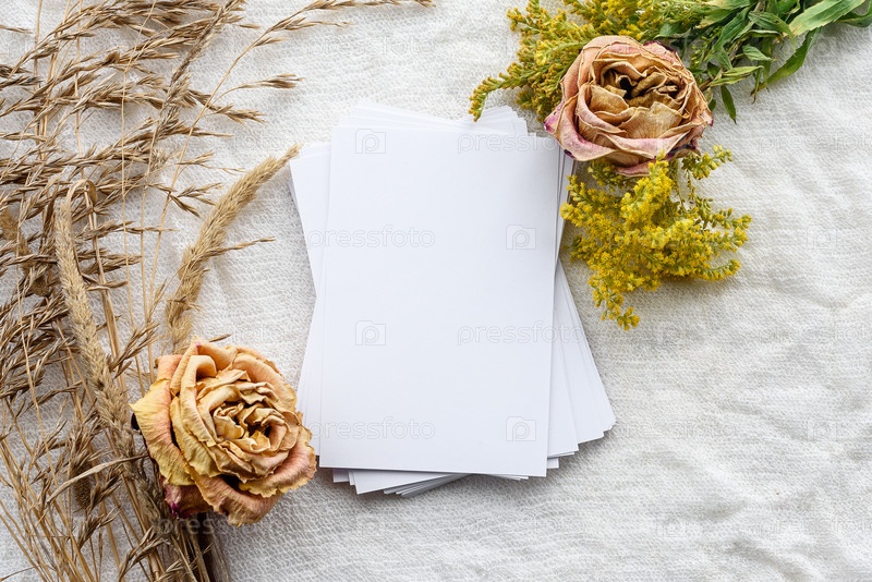 Модный женский фон на белой ткани - цветы и пустая открытка. Свадебный женский фон. Заготовка для открытки
