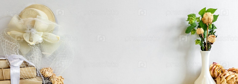 Модный фон канцелярских товаров - белая карточка для письма и веточки сухих растений на белом столе. Свадебный женский фон