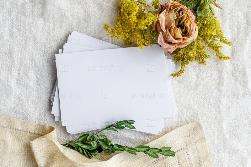 Модный женский фон на белой ткани - цветы и пустая открытка. Свадебный женский фон. Заготовка для открытки