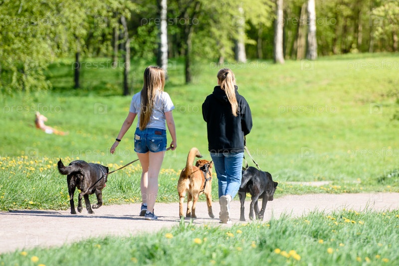 Две девушки выгуливают собак в парке. Россия. Гатчина. 26 мая 2020 г