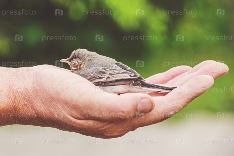 Маленький птенец не умеет летать и ему нужна помощь. Рука мужчины держит выпавшего из гнезда птенца