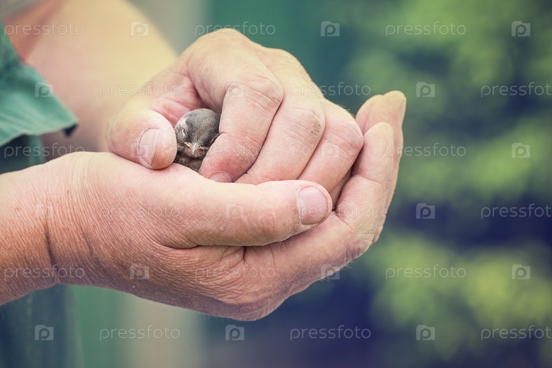 Маленький птенец в руке человека - это концепция окружающей среды и животных, тонизированная