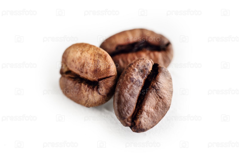 Крупный план трех жареных кофейных зерен, изолированных на белом фоне