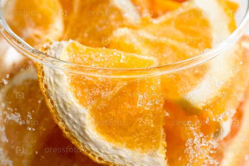 Ломтики апельсина в сахаре в стеклянной вазе. Вид сверху