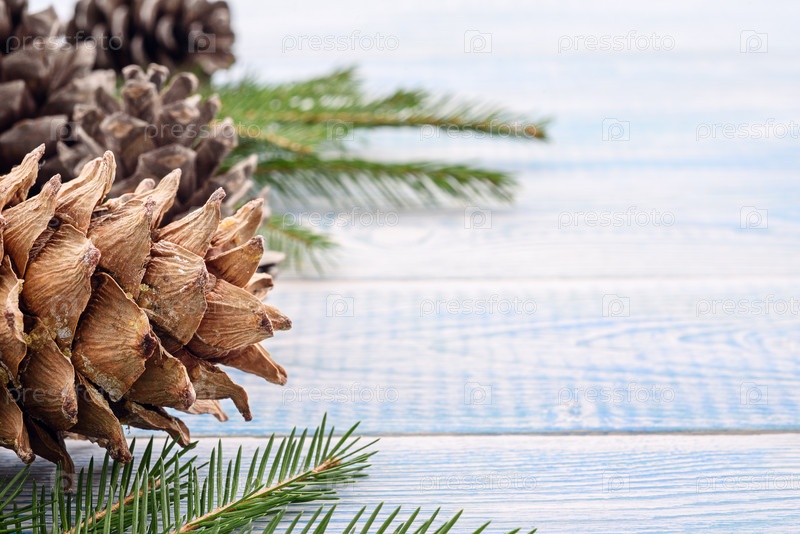 Рождественский праздничный фон - подарки и еловые шишки на синем фоне