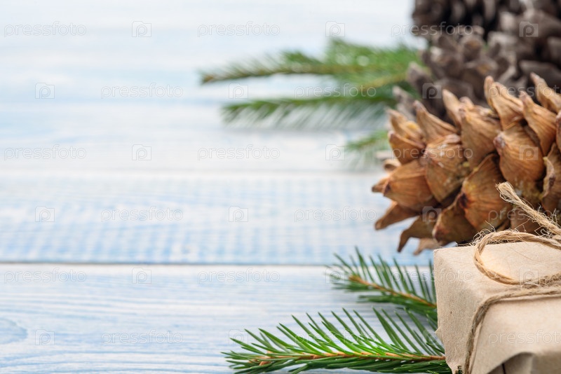 Рождественский праздничный фон - подарки и еловые шишки на синем фоне