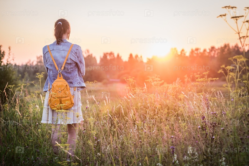Молодая девушка в платье и с рюкзаком на природе на закате, вид сзади