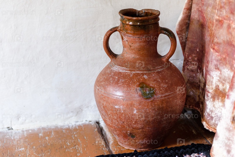 Старый глиняный кувшин в хижине крупным планом