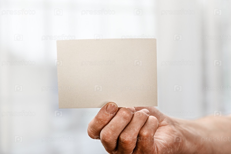 Белая пустая карточка в руке мужчины на белом фоне. Заготовка для дизайнерской надписи