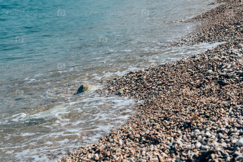 Пляж, мокрая галька, берег моря и волны-морской пляж и концепция пляжного отдыха