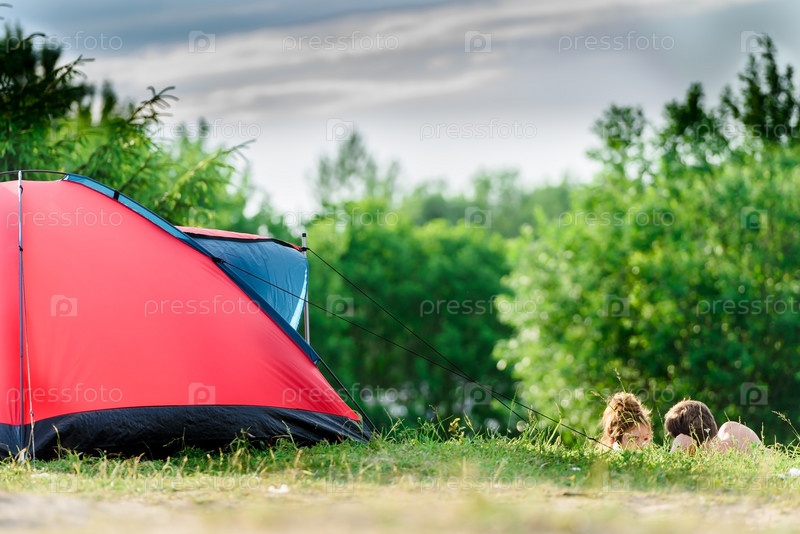 Россия, Санкт-Петербург, 24 июня 2020 года: влюбленная пара с парнем и девушкой отдыхают на природе с палаткой